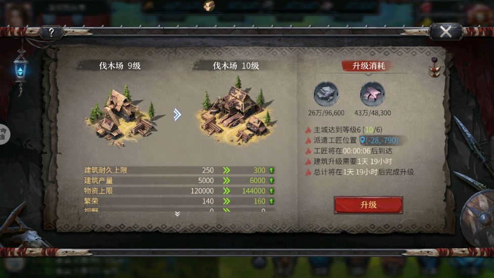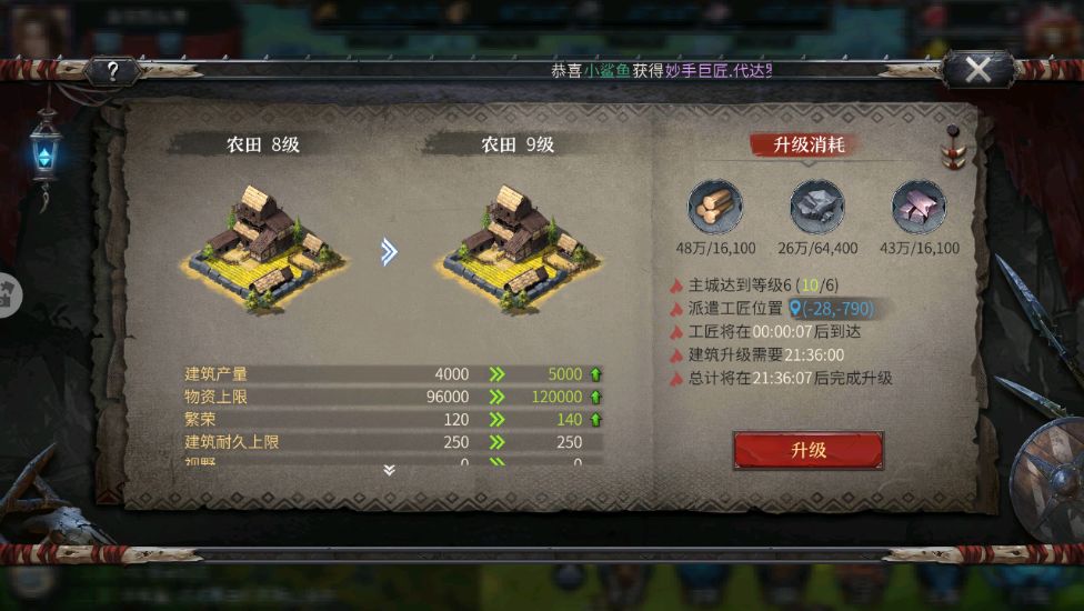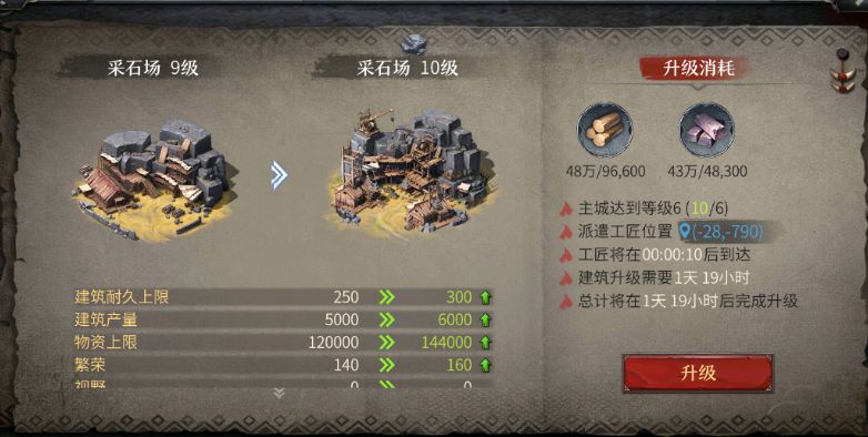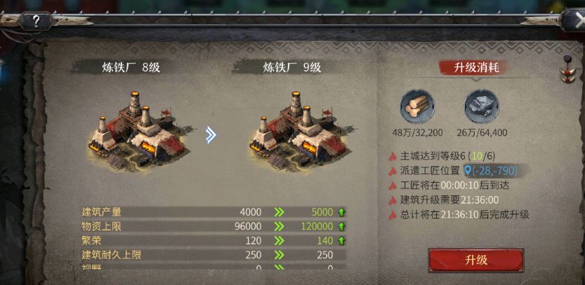 在英雄技能觉醒前先把兵先征满觉醒之后也会少一批消耗资源的士兵,建筑也需要分配资源前面我们比较缺石料所以尽可能的多去升升需不要的石料的采石场,铁矿几乎也是万能需要的材料相比于石料,铁矿不是很缺,再升级采石场的时候也间接的提升了炼铁厂的等级,我们提升资源的建筑顺序一般最好的是采石场、炼铁厂、伐木场、农田分别对应着石料、铁矿、木材、粮食的生产量和物资上限提升