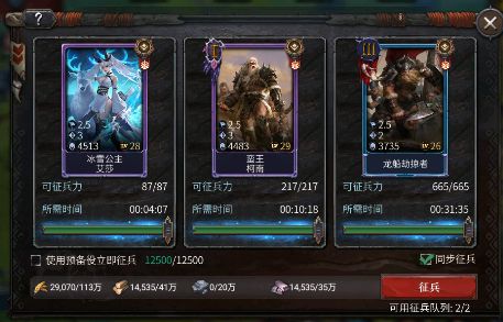 前期英雄等级低征兵所需资源不是很多,才导致了很多人忽略这一点,征兵所需要的资源与与征兵的数量、英雄等级的觉醒有关,每个英雄最多有三个技能分别是解锁技能孔需要一定的等级每觉醒一次都要增加征兵所需要的资源