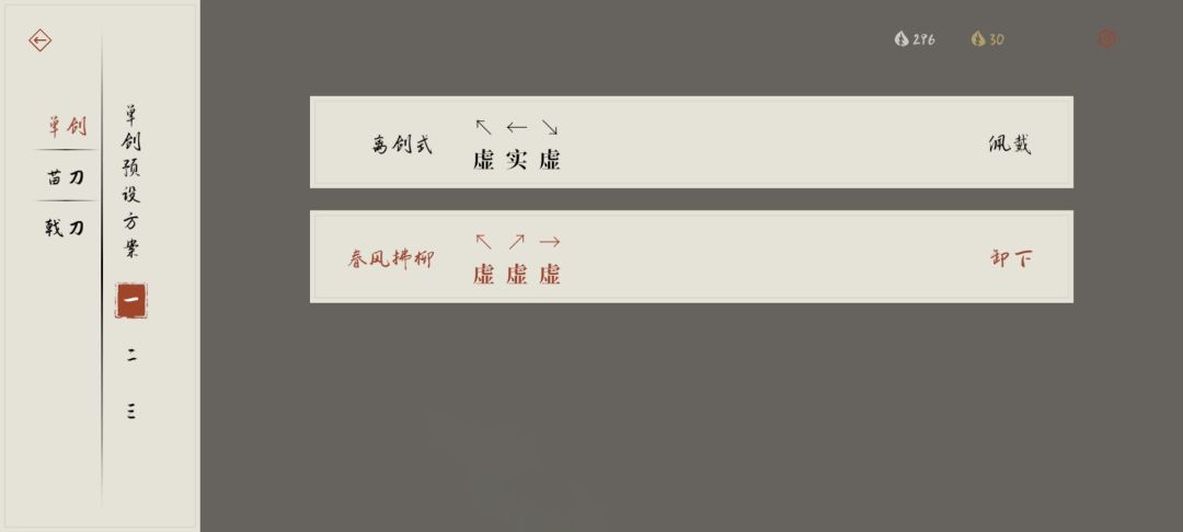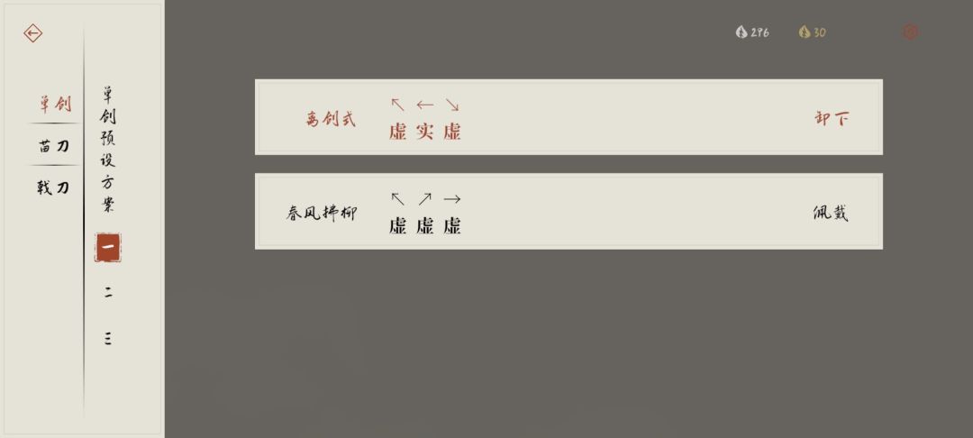 【春风抚柳】左上起手划出剑气,右上剑气,右划剑气。罕见的三剑气远攻招式,常用于消耗,风筝,在对方缺少突进和没有使用【防】习惯时可用。与回剑苍龙,断水前刺剑气相结合,常能使人头痛不已。但与离剑式相斥的缘故,优先推荐离剑式。评分:7分