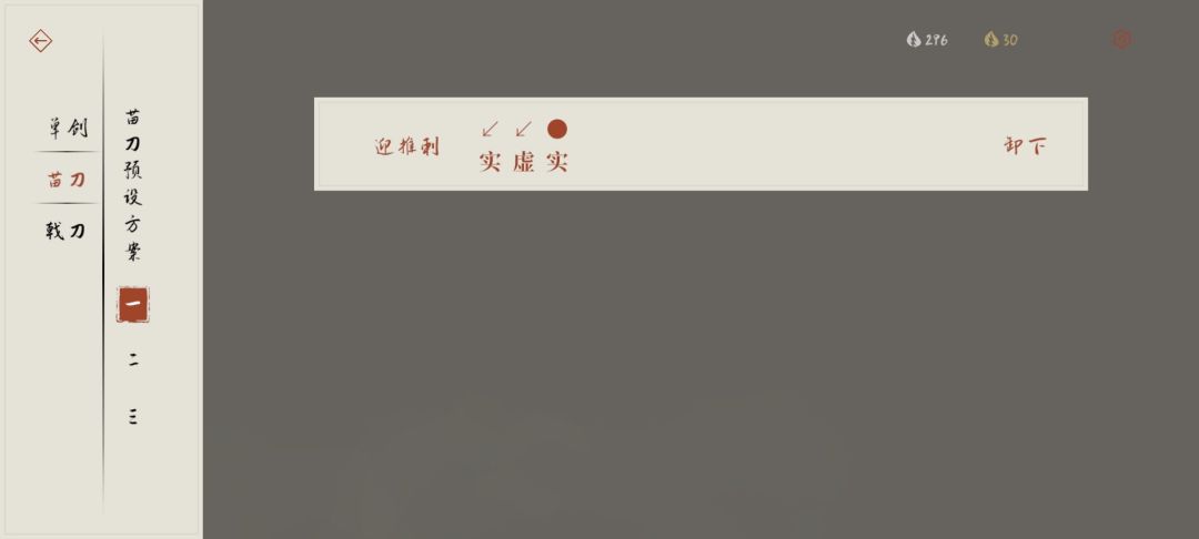 【下削式】左上划后,刀由左上向右横斩,二式扬刀蓄势左下重劈。起手较慢,二式衔接也慢,但起手是御招,在穿插连招时可以选择。评分:5分
