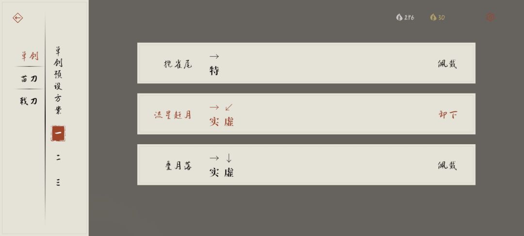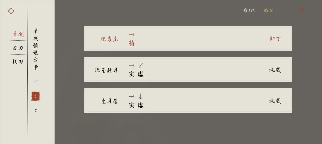 【流星赶月】又称赶月式。起手式轻踏前斩并向前突进,突进约两个闪距离后可以使用二式左下,空中快速划出三剑。装备挫剑式时可二式变招为挫剑。即使一式是实招突进,但也容易被对方在空中打断,且二式的出招时机必须是一式突进两闪过后,实在有些卡手,不过可以用闪取消一式的突进,在滑步不断连招的设置下快速左下划使出二式,可用于规避对方预判的正劈刀或白虹贯日。不过与叠月落相比还是稍逊。评分:5分