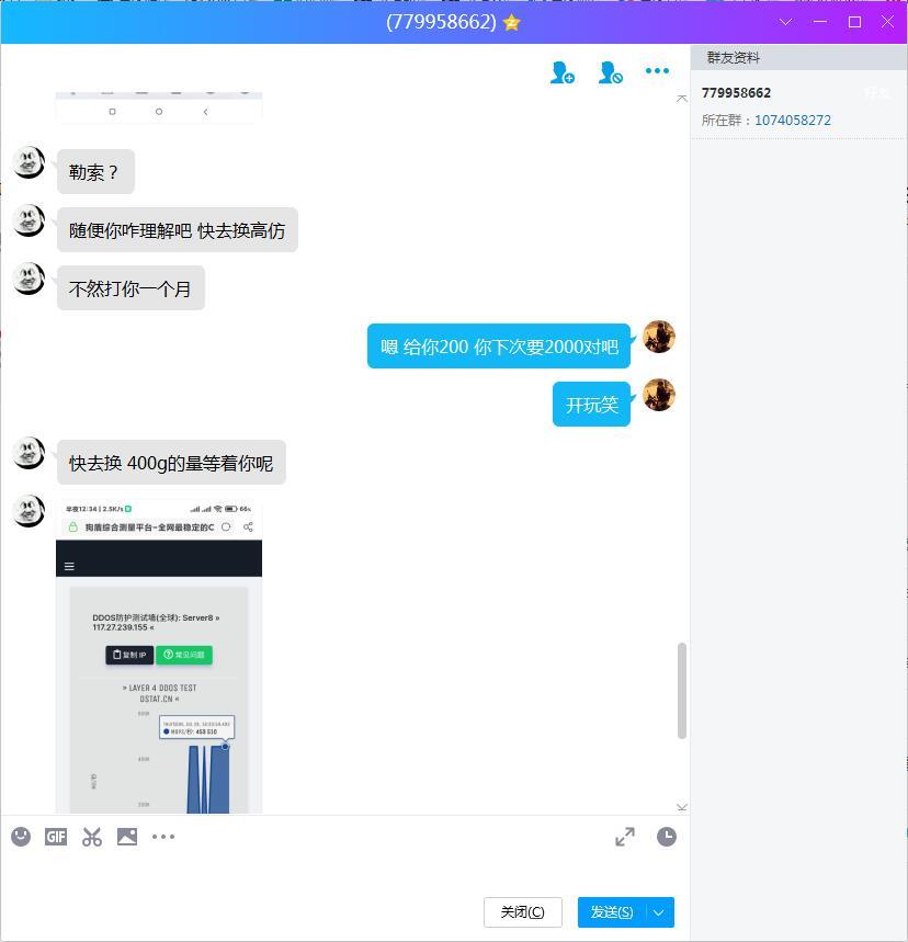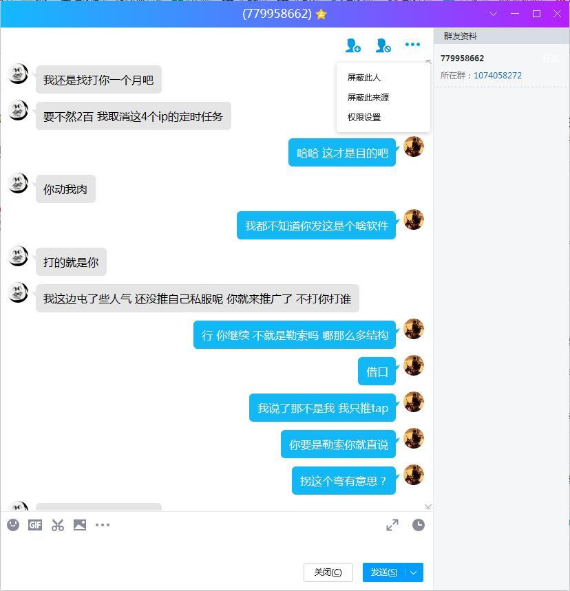 对于这种黑恶势力,兄弟们,你说咱们作为一个站着说话的人能屈服吗?让他打一毛都不会给他,刚开始给我都说迷糊了,后来想想什么三楼我都不知道是个啥玩意,这特么就是他自己去发了过来当接口勒索的,垃圾人