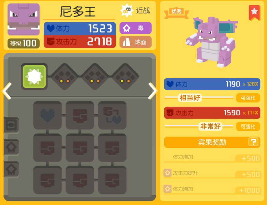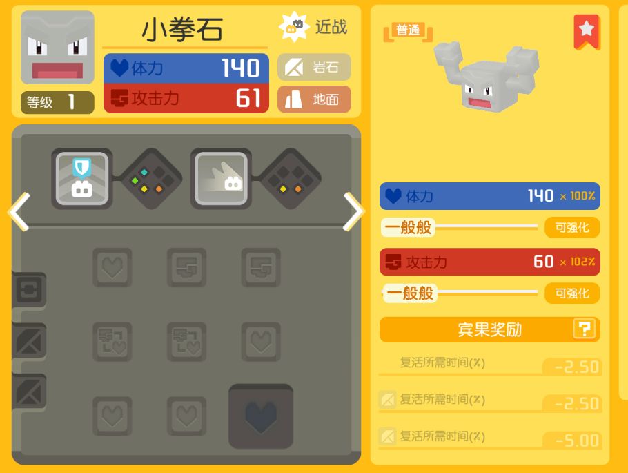 这一类很简单粗暴,要么加攻击要么加体力,如上图稀有宝可梦第三宾果(1000)会比普通宝可梦(500)加的多。 一般三宾果都是攻击或体力,是冲战力榜最好的选择,大部分宝可梦如果不冲榜就没有练的必要,当然像超级角击这种虫系宝可梦都没办法学习的技能,吃不到虫系减cd,最好的宾果就是这种简单粗暴的直接加成,不仅可以冲战力榜还可以在实战中发挥巨大作用。