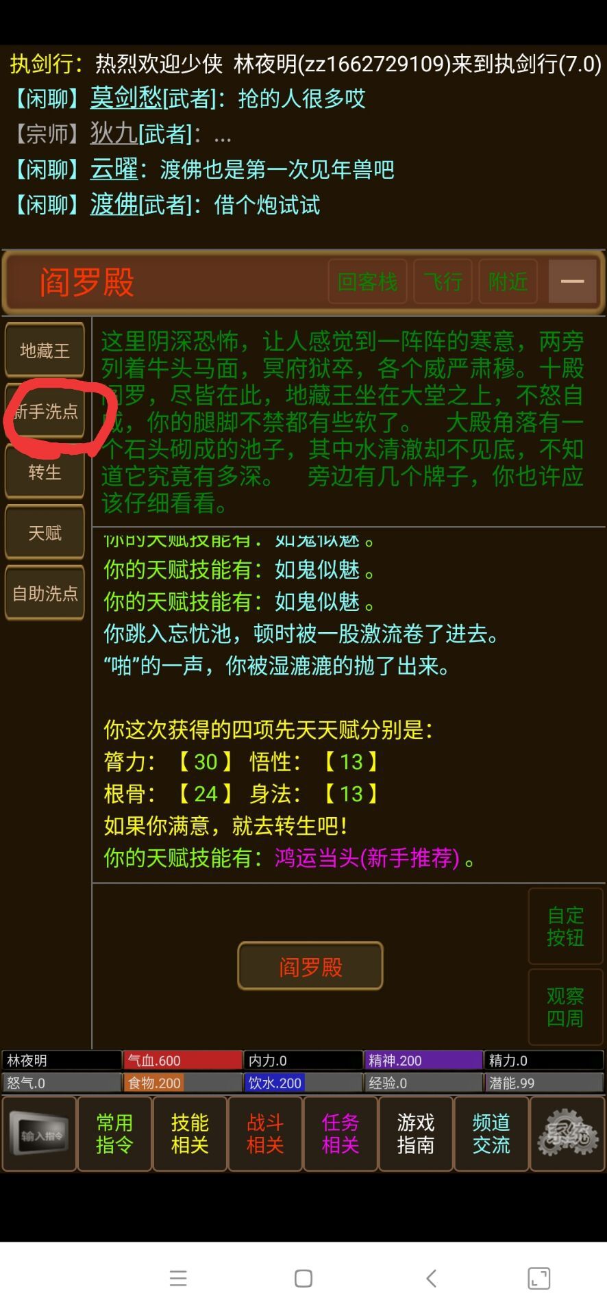 到了投胎界面,点击第二个选项:新手洗点。[推荐臂力流]打的就是无脑,血刀打的是一套,一个技能就没了。臂力:攻击力身法:闪避根骨:血量悟性:学的更快