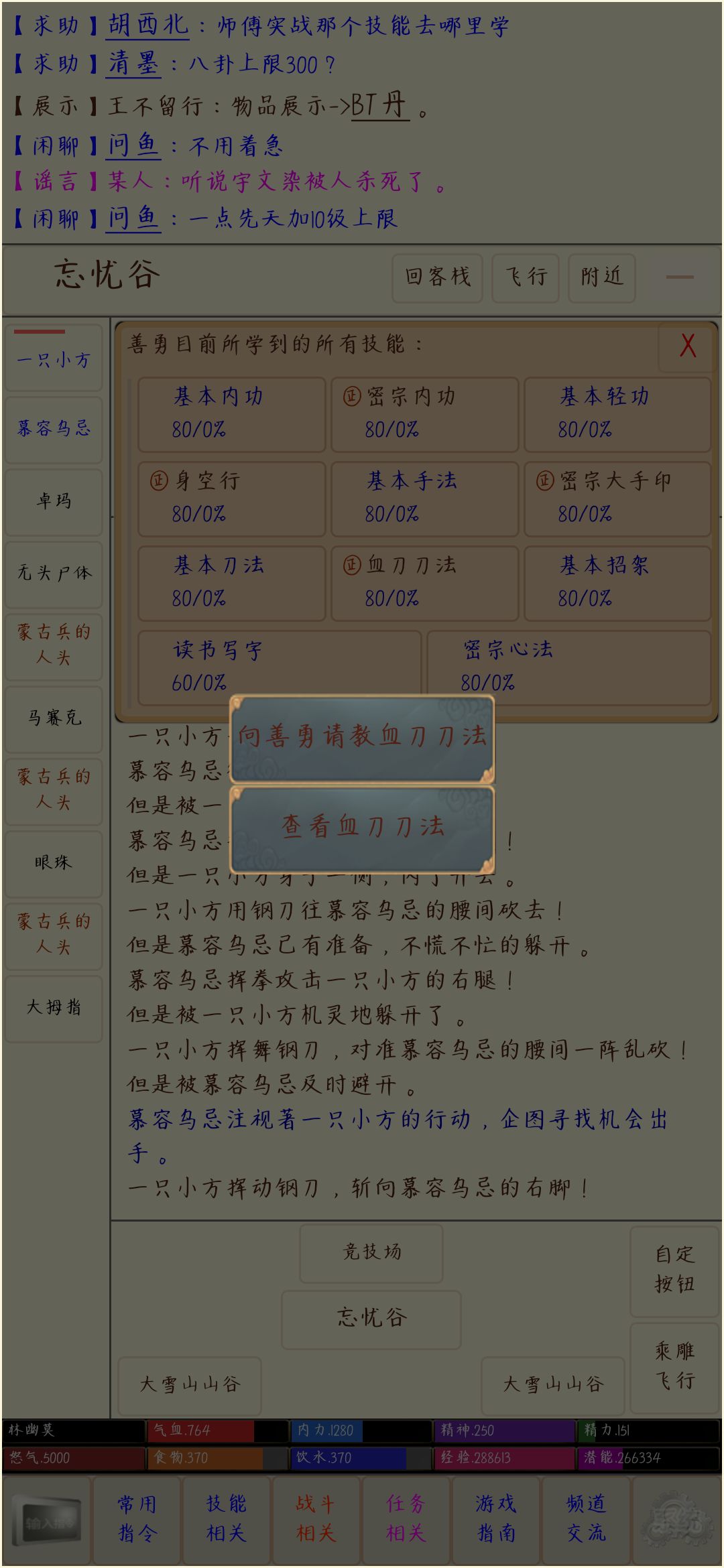 然后点击查看技能,在善勇这里先学基本刀法和血刀刀法,然后学一点密宗内功就行了。