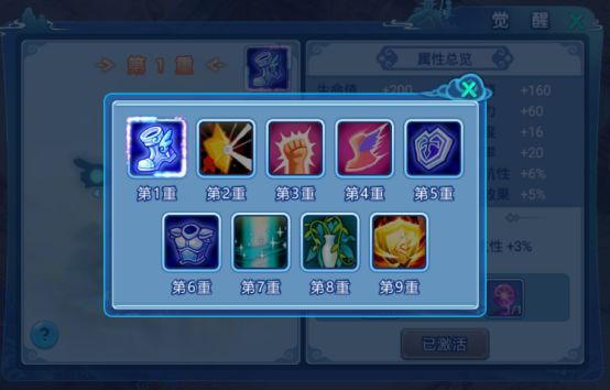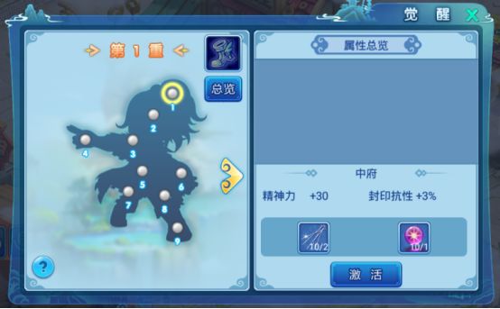 觉醒系统一共有9重,每重包括9个穴位和1个核心。穴位不需要按顺序激活,但核心需要把9个穴位激活后才能激活。当核心与穴位全部激活后可以开启下一重。
