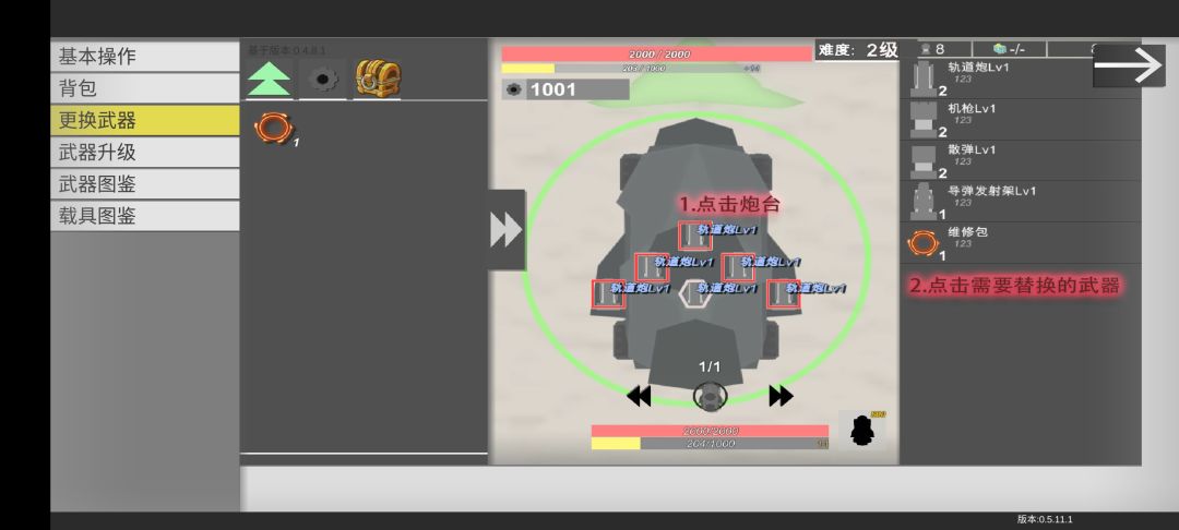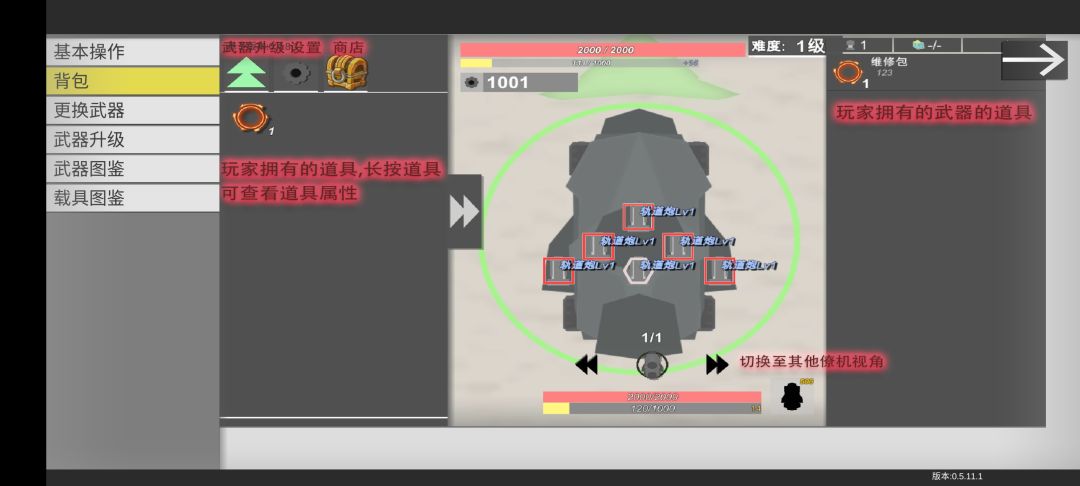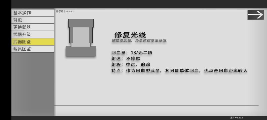 里面的武器介绍很详细,像是激光四级会有新的技能,修复站二级会有新技能,地雷三级射速降低但一次性三个,等等等等~