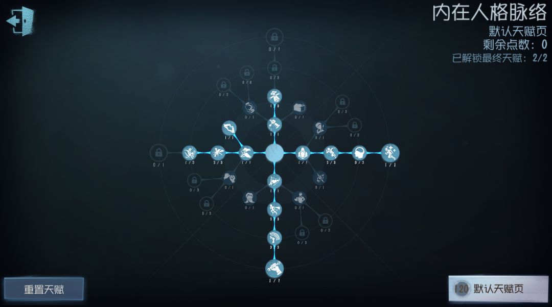 点出【化险为夷】,在救下上椅求生者后,能为自身和被救下的队友提供20秒的无敌时间来远离遗产机。因为病患可以利用钩爪进行远距离位移,所以这套天赋只点出一层【膝跳反射】,所以对自身牵制基本功有一定要求。但天赋中点出了【不屈不挠】,即便救人后被击倒,也可以快速自愈然后破译密码机或寻找队友治疗,减轻团队压力。