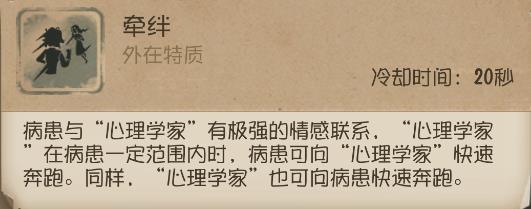 当病患与“心理学家”同时登场时,这两名求生者也能利用【牵绊】来做出一些特殊配合,例如当病患或“心理学家”其中一人在被监管者追击时,另一人可以提前沟通好路线,在被追击者的前方引路,两者在一定范围内时可触发【牵绊】,为被追击者提供加速效果。