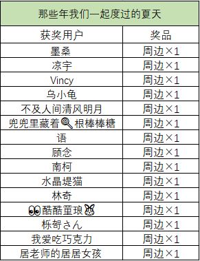 以下为“那年,那人,那个暑假”和“那些年我们一起度过的夏天”的获奖情况,恭喜幸运的小伙伴们~