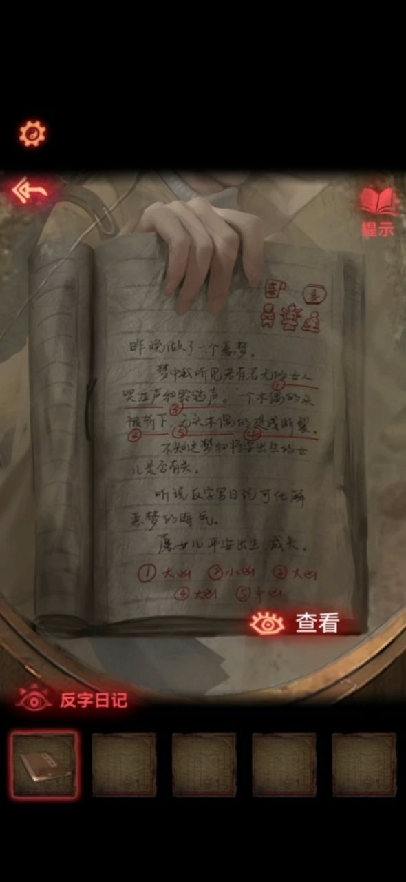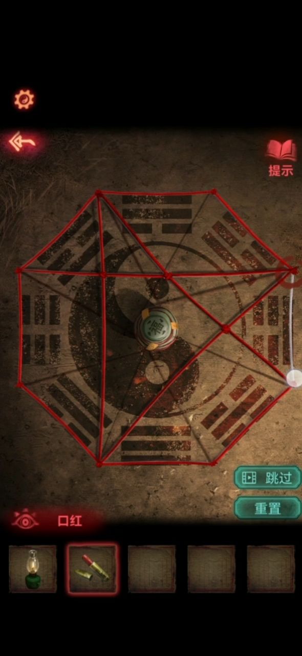 7.纸条上圈出来的字就是地下暗门的答案,打开之后,进去,镜子旁的本子上得知,将线涂红阵法就消失了,拿到刮刀,回去梯子那里,打开报纸糊住的柜子,得到口红,用口红涂红绑着罐子的线,得到另外半张照片,将两个半张放入照片框,将军会出来砍人,把刀留下了,拿刀砍开木门