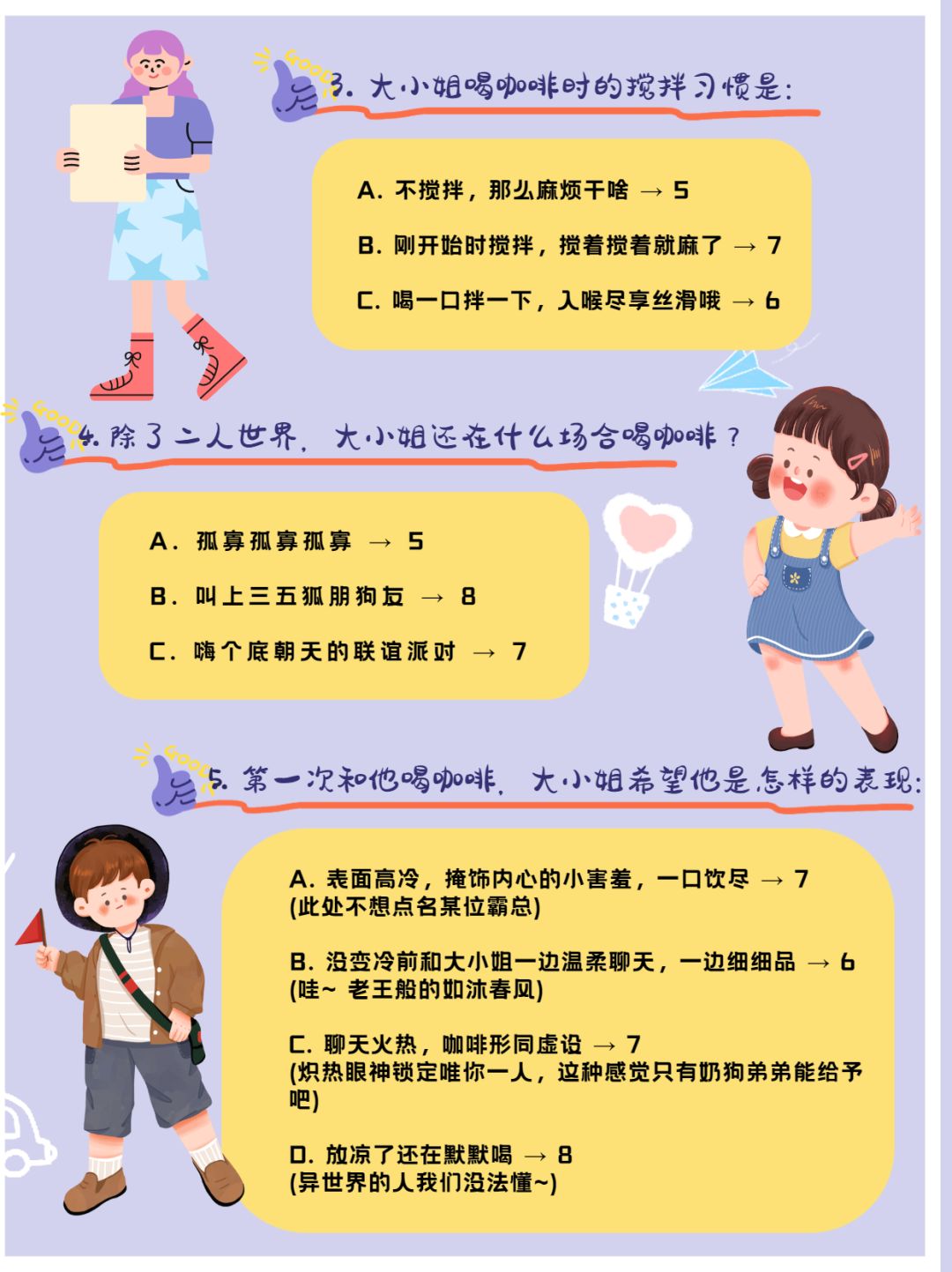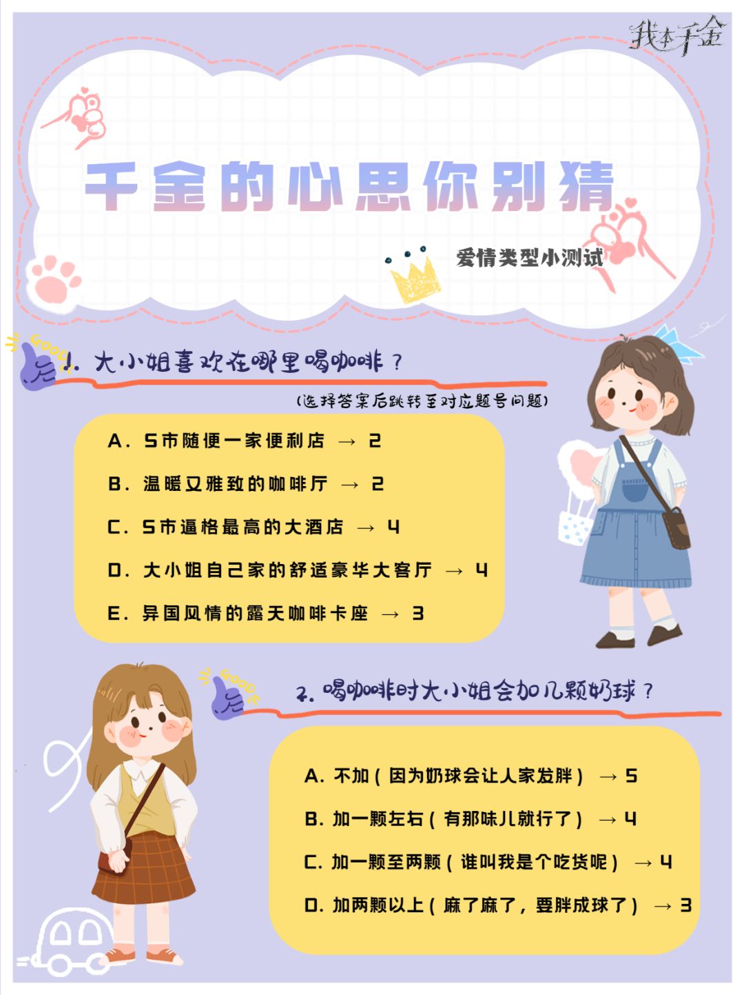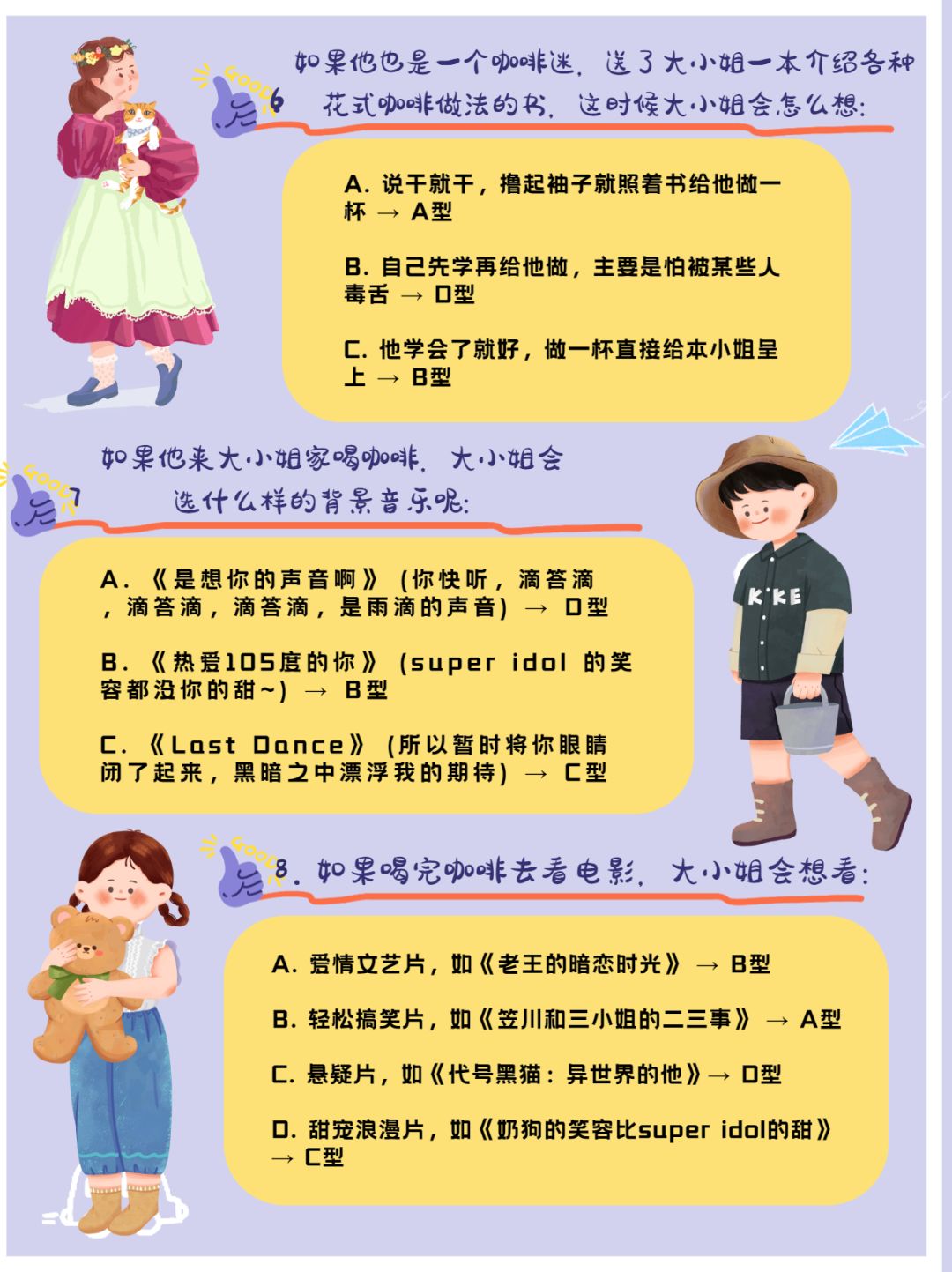 据我观察,三小姐会为那几个ta准备不同种类的咖啡,从喝咖啡的习惯喜好可以看出一个人的爱情态度,那么各位大小姐都会拥有怎样类型的恋爱呢?