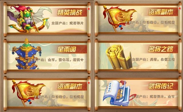 【草船借箭】产出武将装备和武将经验、【火烧连营】产出精铁和进阶石、【空城计】产出大量金币、【长坂坡】产出大量强化石。