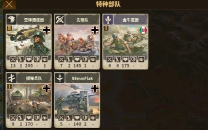 记住哦,同一个兵种的不同特殊部队有不同的加强属性,在集团军模式中,不同集团军的初始特种部队是不同的(依据历史,点赞)