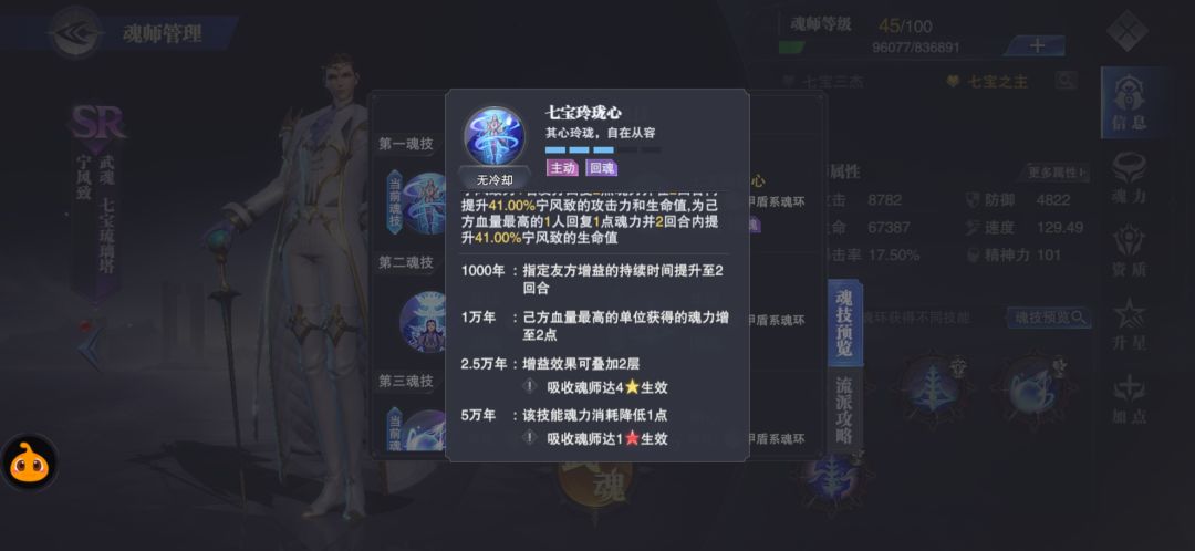 √Tip:尤其使5w年的第一魂技,是宁风致进阶成T0辅助的关键,开局总共加4能量并提高攻击和血量属性值。
