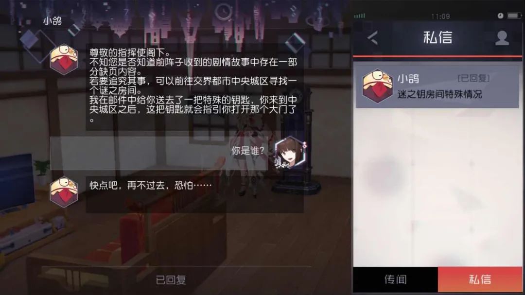登录后,指挥使可收到来自小鸽的私信《迷之钥房间特殊情况》,查看后并前往吧。