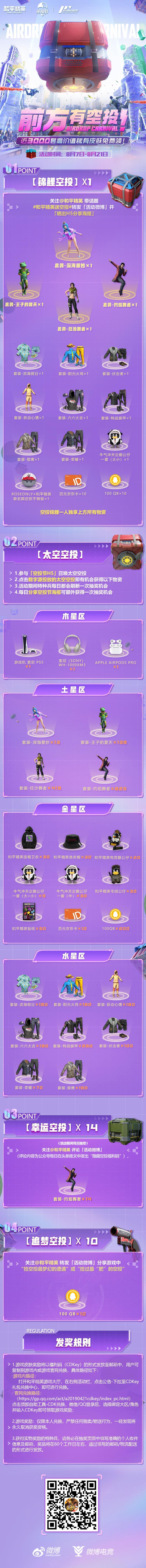 🌟【参与方式二】关注@和平精英 转发「活动微博」,分享游戏中「“捡空投最梦幻的遭遇”或“捡过最‘肥’的空投”」,将抽取10位特种兵每人「100 QB」~
