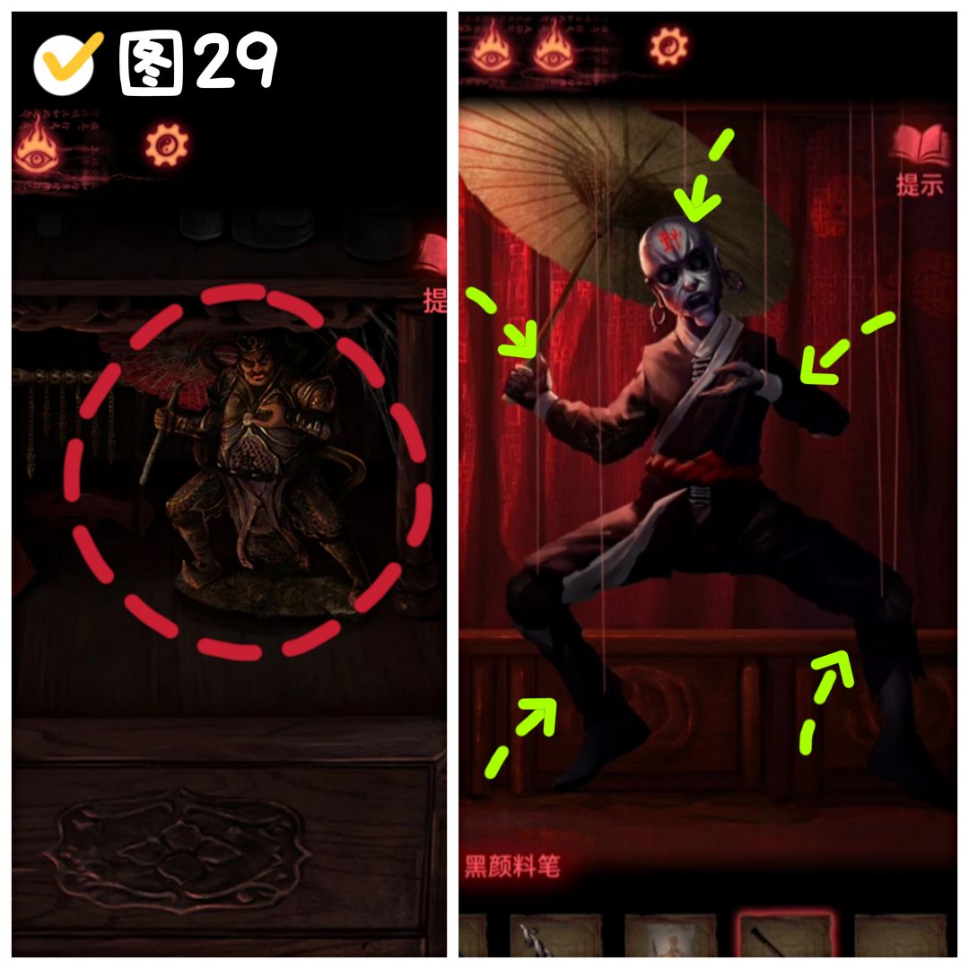 26.根据工坊右侧柜子上的北方多闻天王雕像姿势,调整木偶至如图,伞开。伞为散,戏台左侧黑暗通道处的戏子离开了。(图29)