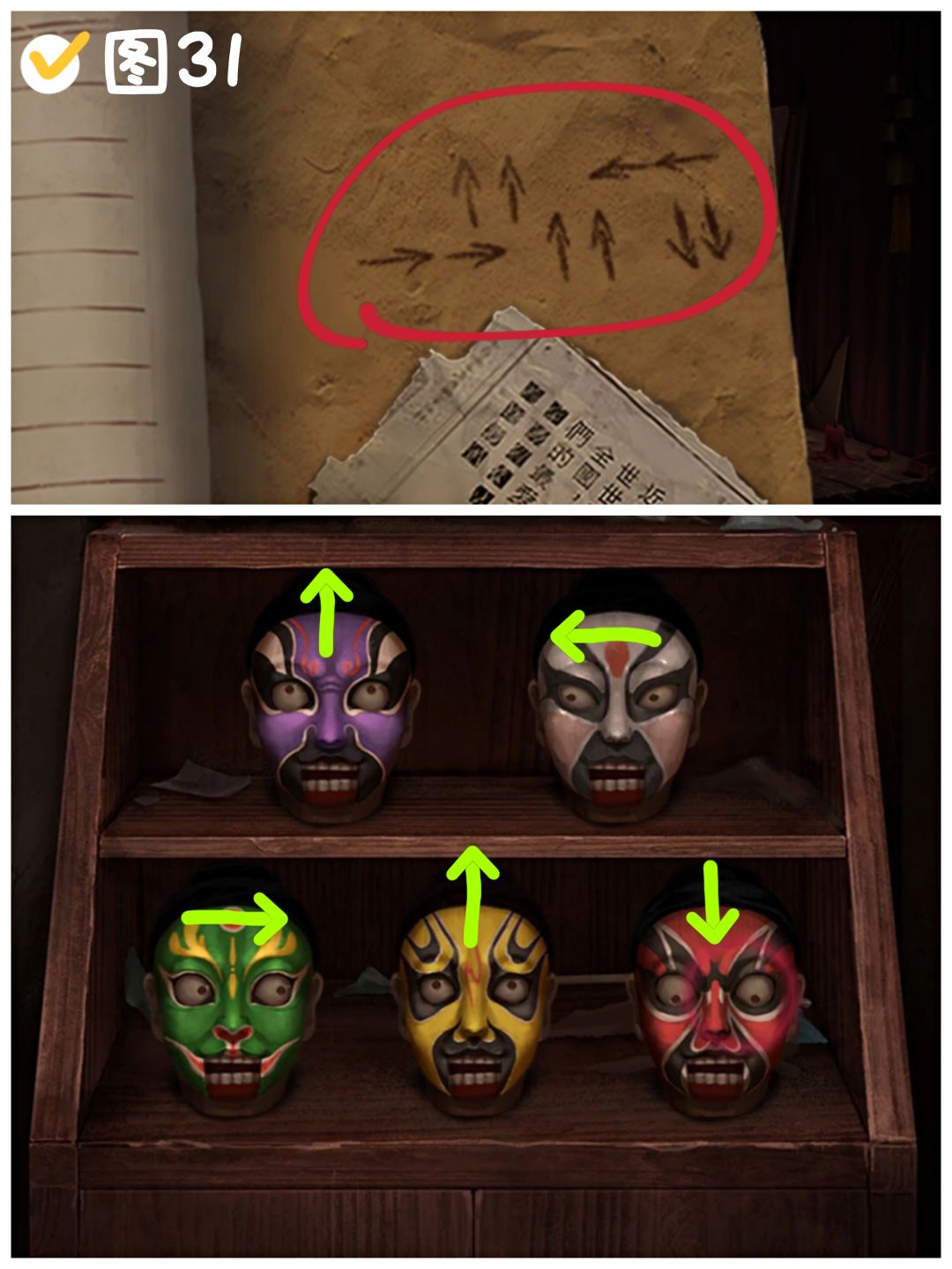 28.观察梳妆台上的黄色笔记本,最后一页获得线索,根据线索改变工坊左侧柜子上脸谱眼睛的朝向,获得〔一组木杆〕。利用木杆缀结皮影,获得组装好的〔皮影〕。(图31)