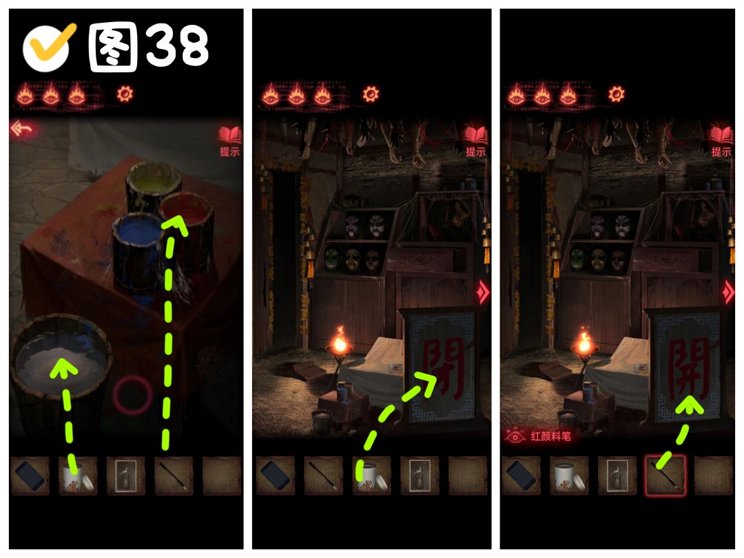 35.回到工坊,门出现。用空瓶装些颜料桌旁的水,获得〔卸妆水〕。用卸妆水擦掉门上的“才”字,然后用眉笔蘸取红色颜料写上“开”字。(图38)