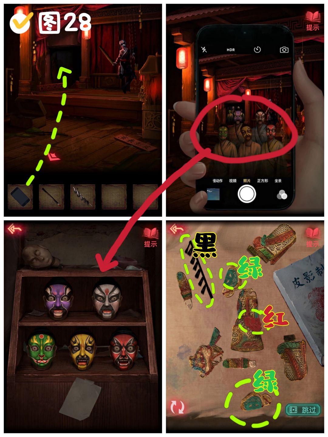 27.后台左侧箱子获得〔皮影的头〕。梳妆台上获得〔空瓶〕。点击后台的红布,点击戏服,戏服掉落,捡起获得〔戏服〕。