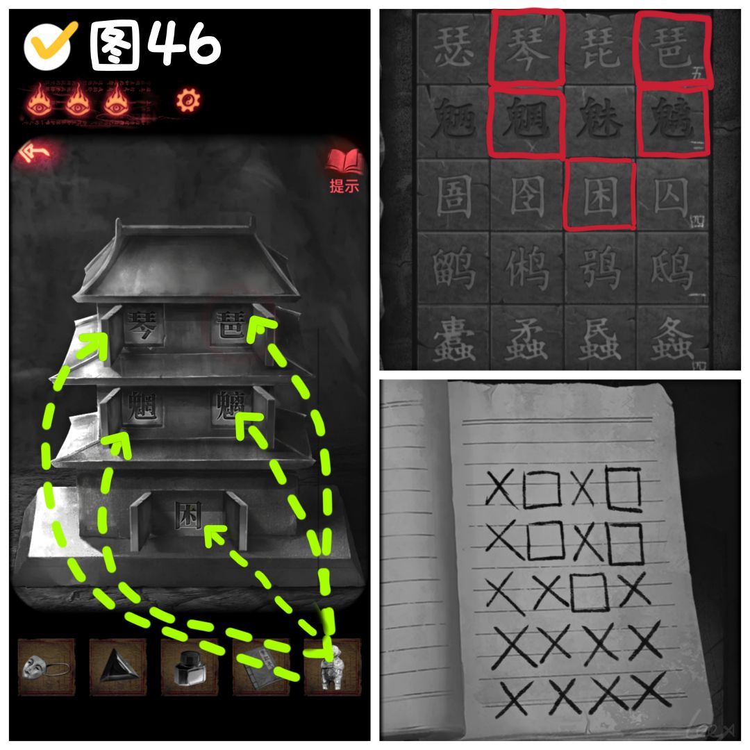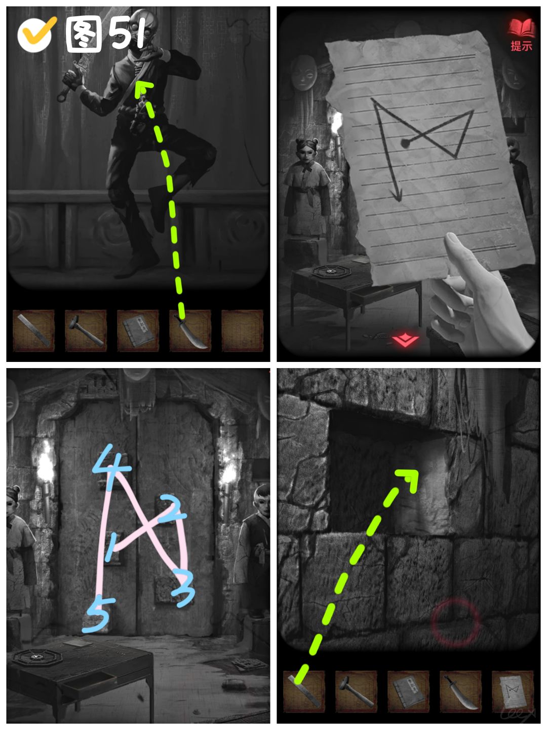 48.来到戏台,用大刀砍木偶,墙上出现图案,记下〔提示〕。根据提示顺序点击石门上的机关,门开,出现台阶。将铜尺藏到男童上方暗格,离开。(图51)
