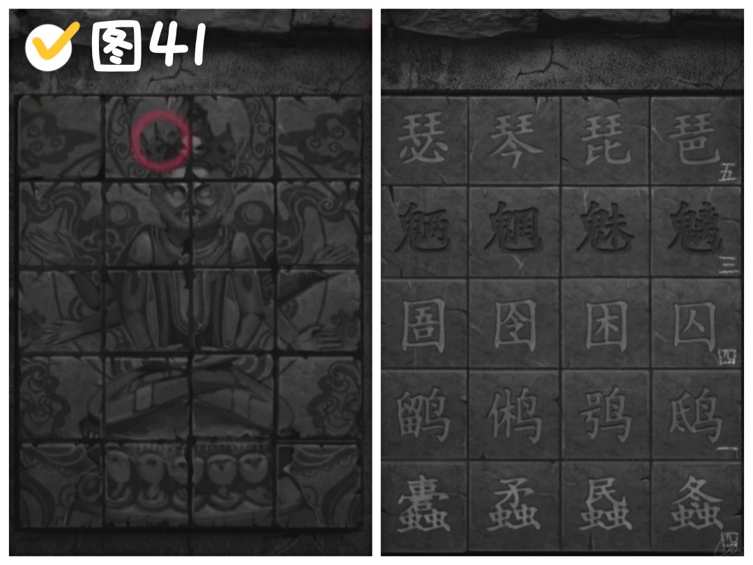 38.完成藏经阁左侧墙上的拼图,如图,石板翻面,卡住了,使用锤子,获得提示。(图41)