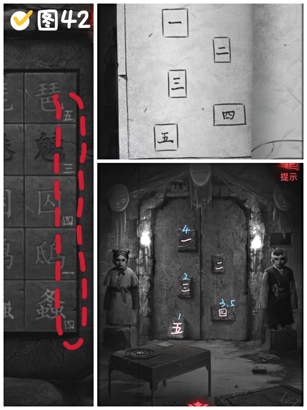 39.根据拼图处提示“五-三-四-一-四”,结合金童玉女前桌子上书籍的第二页石门上石块的编号,按顺序点击对应石块,石门打开。(图42)