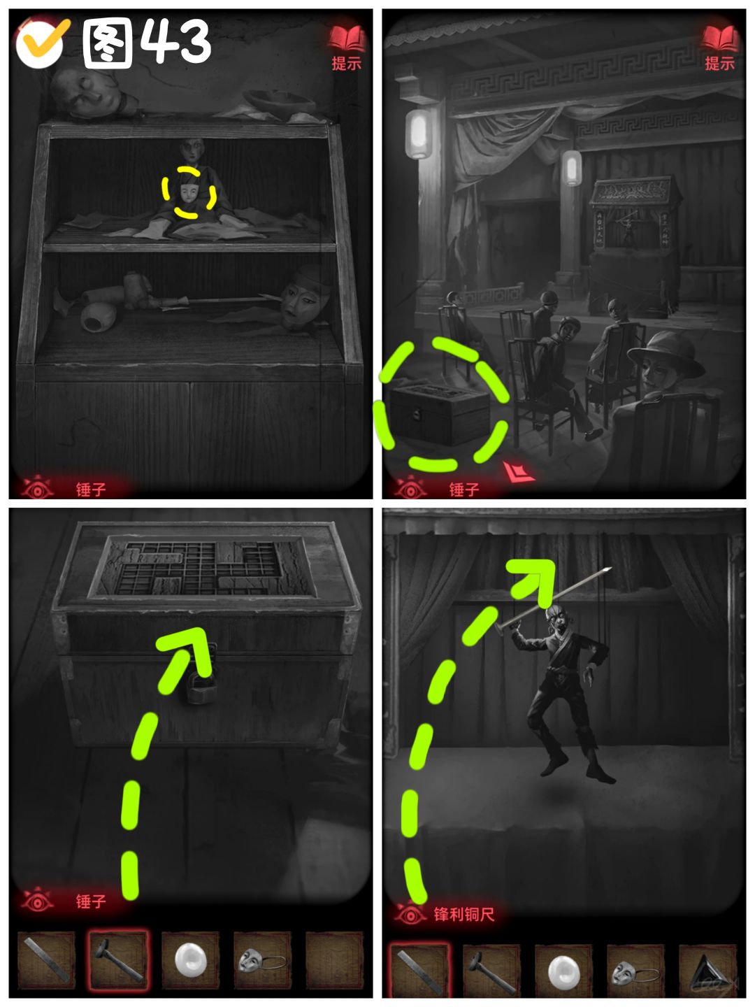 40.进入工坊,工坊左侧柜子上获得〔小面具〕。工坊向右走到达戏台。用锤子砸开观众木偶身后的箱子,获得〔三角宝石〕。用铜尺割断小戏台上木偶的提线,拿走〔钉子〕。(图43)