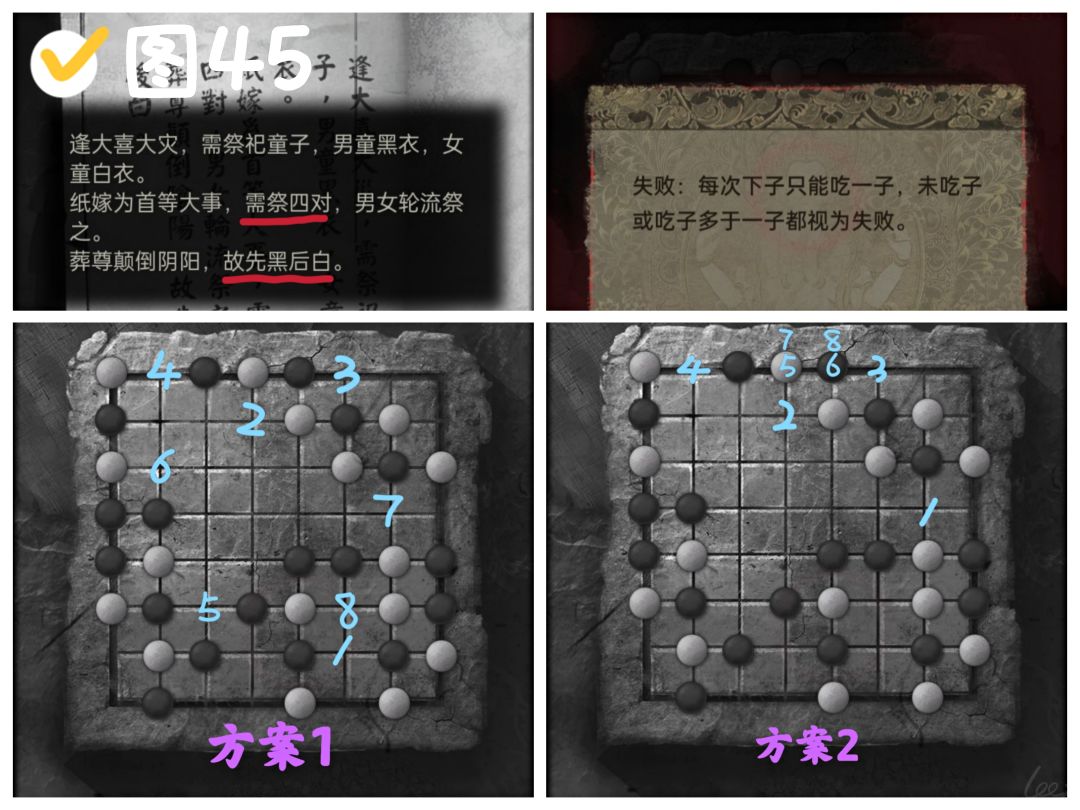 42.回到地宫金童玉女处,根据桌子上书本第一页提供的线索完成棋盘谜题,先黑后白,需祭四对,下子顺序如图,获得〔无面磁人〕。(图45)