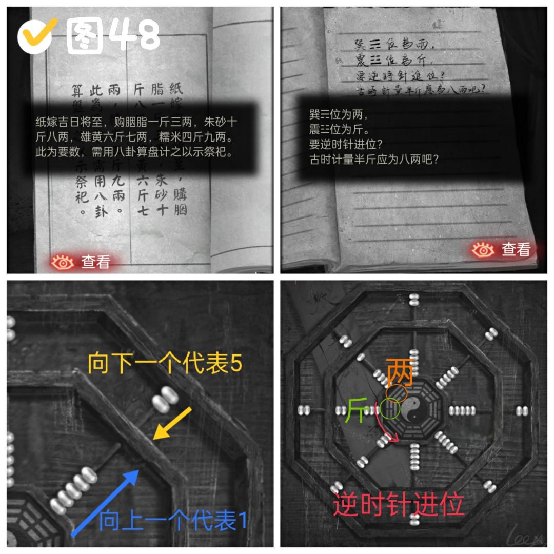 结合左边柜子上日记的最后一页和工坊内桌子上的配方,所有配方加起来一共22斤11两,用算盘摆出22斤11两,解锁阴童子前桌子上的八卦算盘,如图,获得黄纸。(图48)