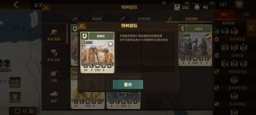 从基础属性上来看,所有迫击炮似乎相对于其他兵种来说,属性似乎更低。不过游骑兵在这一个普遍属性不咋地的兵种,里面属性可以说算得上是名列前茅,拥有一定的攻击力,机动性和生存能力,综合能力可以说是非常平均因为其强大的连击被动存在,让他经常成为哥萨克的替代品,虽然输出方面比不上哥萨克更高的攻击,还有固定的伤害增加但是他高达三点的防御,让他没有哥萨克那么脆本身的攻击力用作对付,一般兵种来说也是够用水准而且生存能力极佳。两个腿是增加机动性的最低标准,再加上同盟国的步兵普遍腿长,让游骑兵的机动性如虎添翼不过由于他是迫击炮的特性让他因为输出乏力而导致被动,难以触发,必须配得上高级步兵才能有明显提升对于善于打节奏的人来说,他是哥萨克的不二替代者,但是对于比较喜欢平推的人来说,它可能就不如442或者一个反坦克。综合水平根据玩家自身而定因为本身作为迫击炮的先天缺陷,还有极其强力被动,让他定位比较麻烦,具体使用手感还是因个人风格而异我个人是比较推荐升级的,毕竟是唯一两个可以进行持续输出的步兵但是对于稳定输出比较高的同学,可以考虑不升,毕竟是个迫击炮。但是不可否认的是,他依旧是最强的迫击炮。![[嗒啦啦2_优秀]](https://img.tapimg.com/market/images/bbb6da13ee1c31ee1405e261f12f366e.gif)