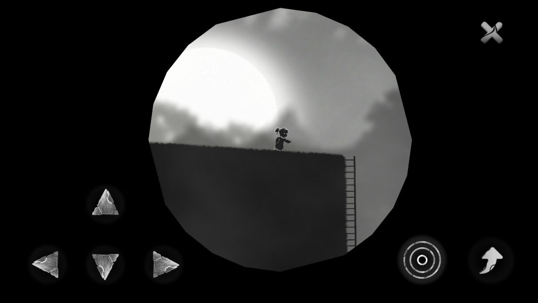 ②通过荡藤条来到小平台上。将正方体向左推落。这时大球和正方体都会沿着斜坡滑落