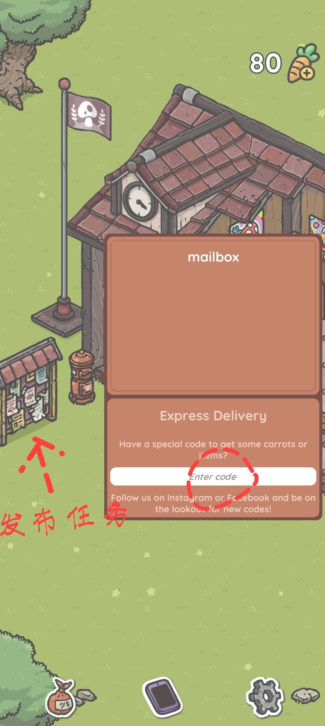 完成目标鱼🐟捕捉任务可以获得更多🥕,邮筒可以输入码来获得福利