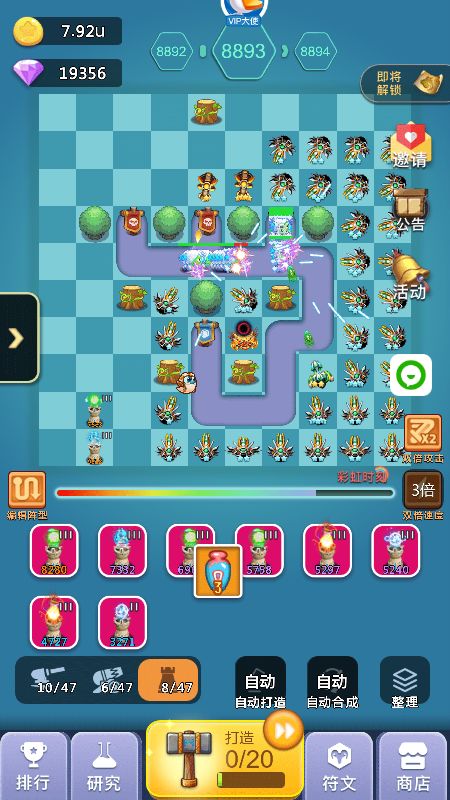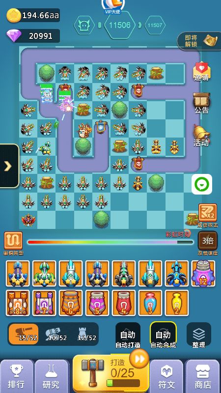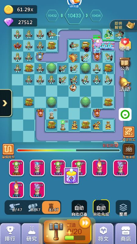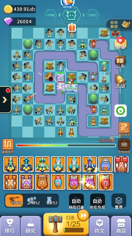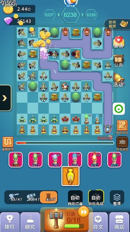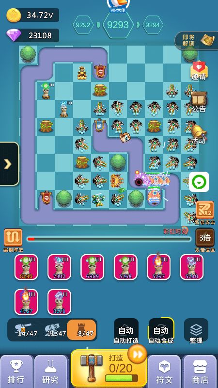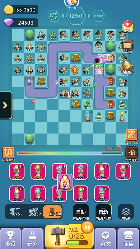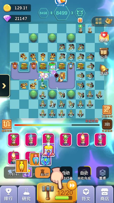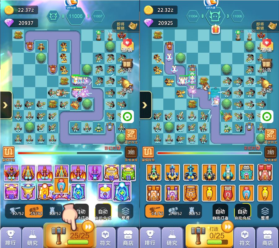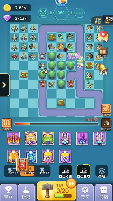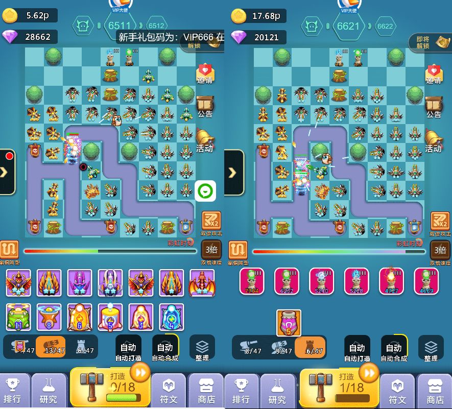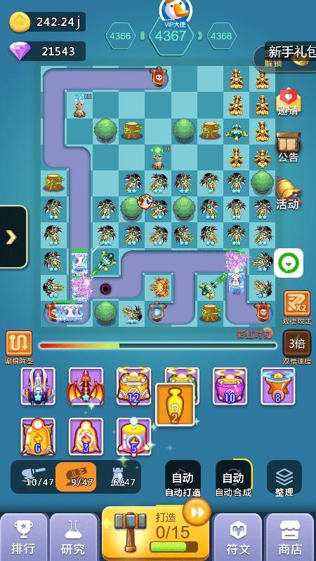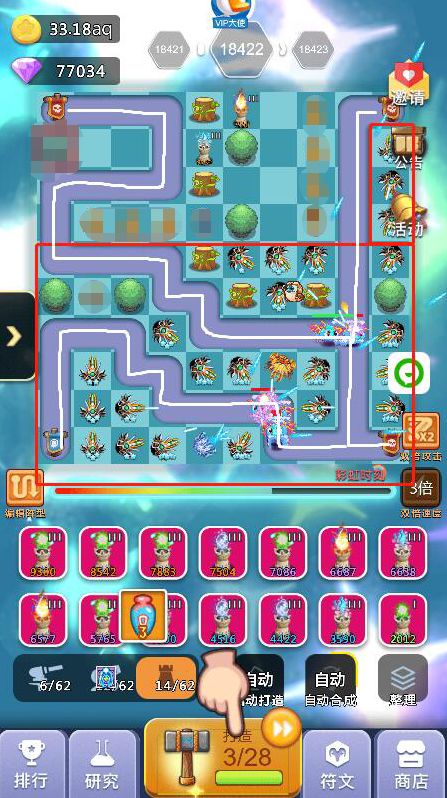 2、中期:超过2000关以后你可能会卡一段时间,这段时间就是你打好基础的时间,这段时间如果你发现飞龙+天使已经打不动了,你可以开始替换成圣光+狙击手组合,这个组合在没有橙炮饕鬄之前可以让你通关比别人快,加上我的线路图的圣光错位摆法,同时攻击多个怪物可以缩短通关时间,而且这个阶段也是比较难熬的时间,如果没有抽到橙炮:饕鬄,那么就要收集99个心合成,合成加农炮信物再打开随机出现加农炮橙炮,记住前期不要随便用玄铁锤,存着出加农橙炮洗饕鬄,洗一次32个锤子,洗出来的饕鬄被动百分比多少都无所谓,影响不大,有了饕鬄你就开始进入后期起飞状态,前几天挂满一天1000关以上,另外这个阶段没有饕鬄之前打好基础,比如宠物游历可以带回装备,矿工套装优先,没有矿工就带轻盈套装,刷出矿工后每新通一关至少获得8钻石,1000关就是8000钻石(33%双倍),这也是前中期比较大的钻石收入来源之一,加快你的游戏进度,不必太在意前中期比别人排名高,当你几千关就有了矿工套后,达到10000关以后你会发现钻石会多很多,如果是平民的话会感觉勉强够花,V5以上就会比较富裕,这个取决于俸禄是否双倍等等,会有收入提升。