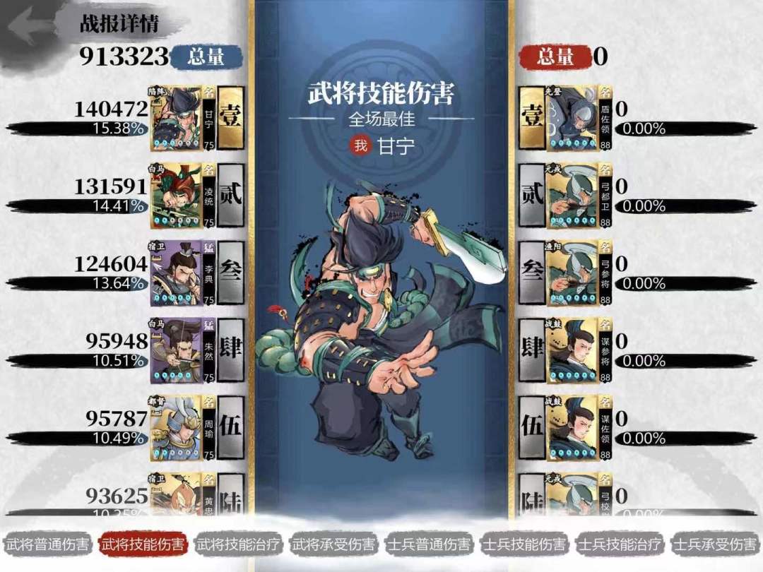 朱然被动我是给全场最佳buff孙尚香以及我的三星甘宁(全武力)。甘宁作为我为数不多的高星武将,感觉做前排全运气确实可惜了,实践证明输出还是很可观的。