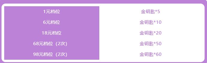 从8月8日开始,五档特惠金钥匙火爆开售!最低仅需1元即可购得5把金钥匙!68元&98元两种档位还可以购买2次!超值超划算,舞者们还不快去抢购~!