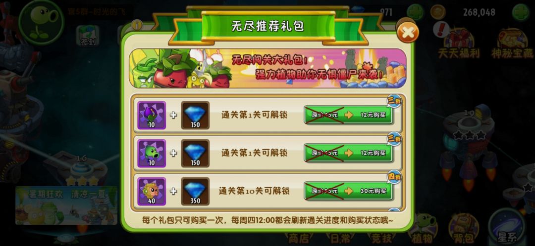 推荐礼包,这是个坑人的活动,不值,不推荐购买:推荐商店,里面的植物可以用钻石购买,每周的无尽,推荐商店里的植物都会随着出现的该世界无尽而改变,在无尽开启前,可以享受8折优惠(,在无尽开启以后价格会恢复成原价,植物的品质越珍贵, 价格越高 。