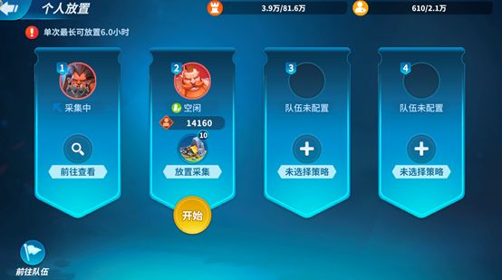 三、开启放置的时间:单次最长的放置时间随着游戏进程和大厅等级逐步提高,需要每日计算时间领取奖励(4小时-5小时-6小时)。
