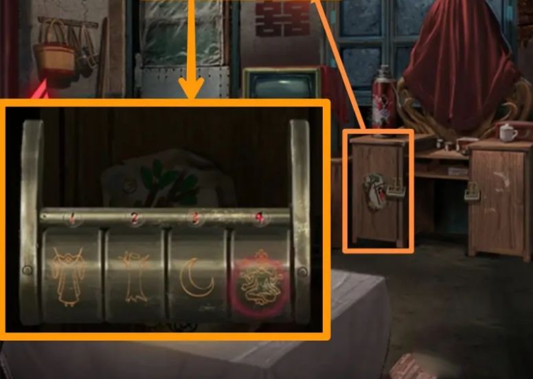 通过剧情后,主角陶梦嫣被关在了房间里,点击客厅梳妆台的左侧柜子,可以看到小时候的涂鸦,涂鸦上①②③④分别对应“吊起来的纸嫁娘”、“树干”、“月亮”、“铜像”,即为柜子上锁的密码,如下图所示。