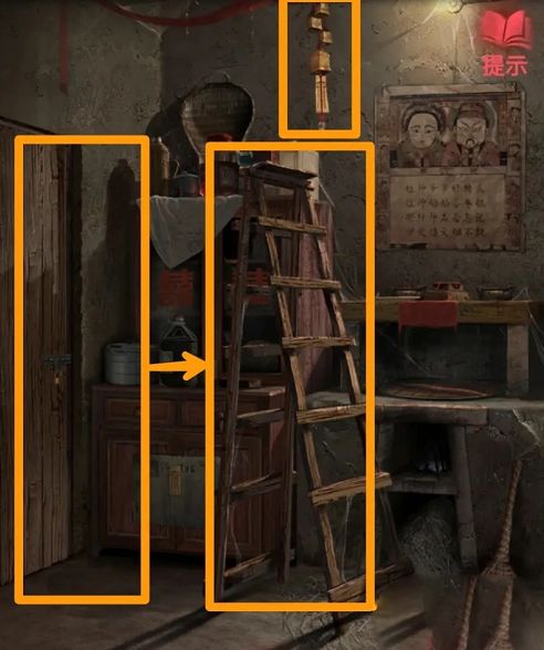 将梯子上的白布取下,点击梯子将梯子移动到房间中央,这个时候可以点击梯子上方的铃铛。