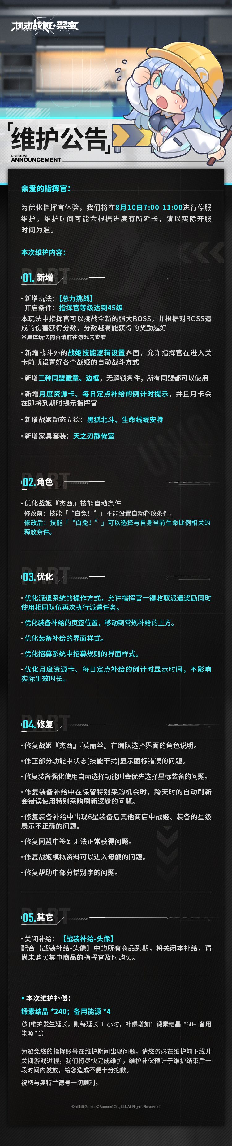 整修完成后我们会为您提供相应补偿物资【锻素结晶*240+备用能源*4】