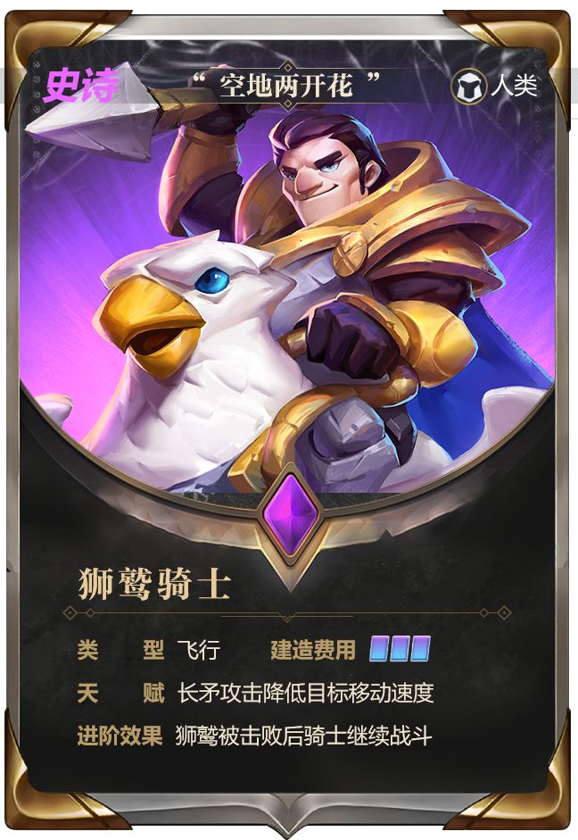 狮鹫这种生物,常常出现在诸多欧美奇幻类的文学、影视作品中。也是剑与魔法的世界中,人类重点驯养的作战生物之一。狮鹫骑士,就是人类种族最先接触到的空中单位。手持长矛的骑士跨上孔武有力的狮鹫飞临战场,凌空投掷的矛在命中敌人后还能附带减速效果,可谓战场利器。然而最特殊之处还不止这些,在通过道具进阶后,狮鹫骑士在受到攻击耗尽生命后,将不会直接陨落,骑士可以降落在地面继续参与战斗。这样一来狮鹫骑士无异于拥有了两次生命,从空中精锐到地面突击手,骑士永远一往无前!