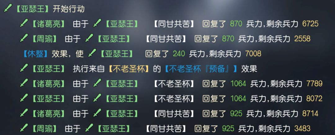 以上为亚瑟王不使用伟大艺术时,其自带技能、同甘共苦、兵种所造成的治疗数据。以下为使用了伟大艺术后所造成的治疗数据,可以明显看出,无论是同甘共苦还是不老圣杯的治疗量都明显翻倍,但马穆鲁克的兵种效果并为受到加成。