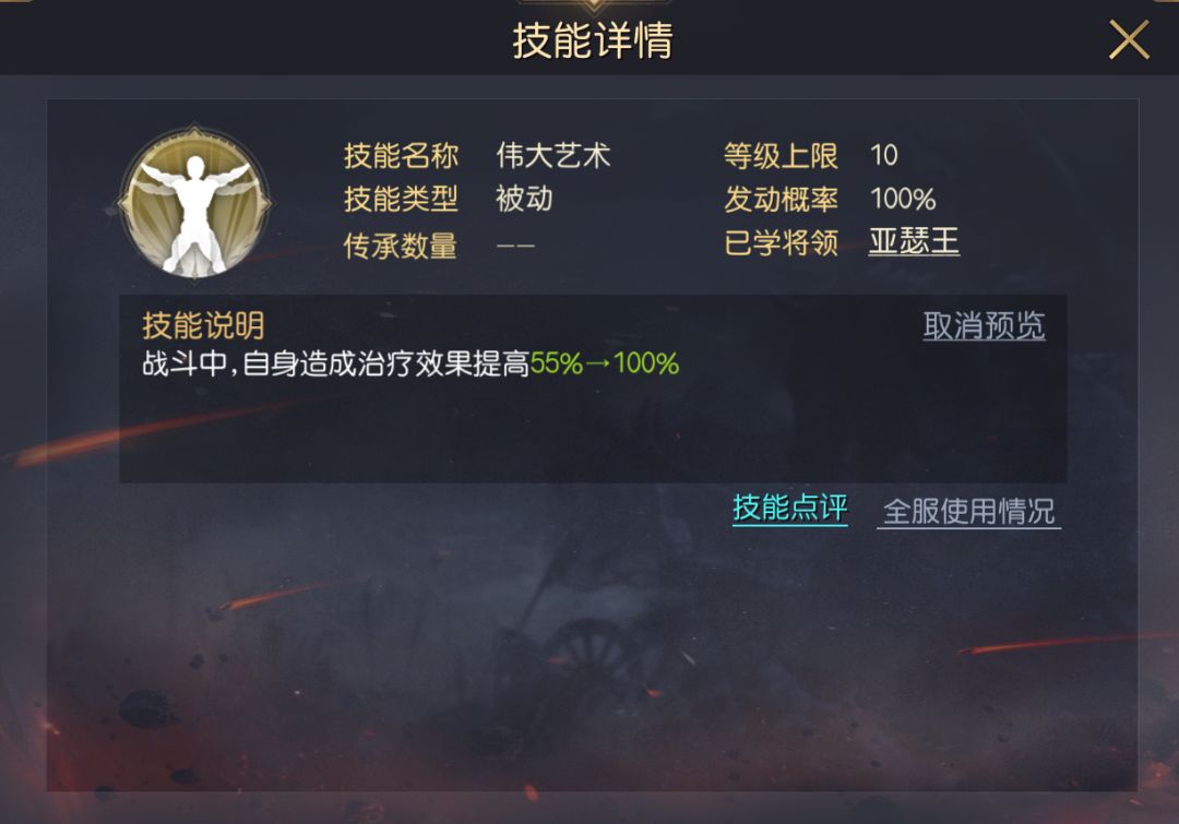 由此我们可以得出结论,伟大艺术的治疗加成,能增益主动治疗技能(如尼罗河馈赠)、被动触发类治疗技能(如同甘共苦、单骑救主)、指挥触发类技能(不老圣杯)。但无法增益兵种特性和倒戈、攻心这类以伤害量为判定标准的治疗效果。