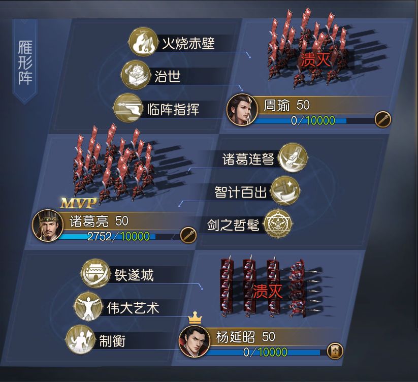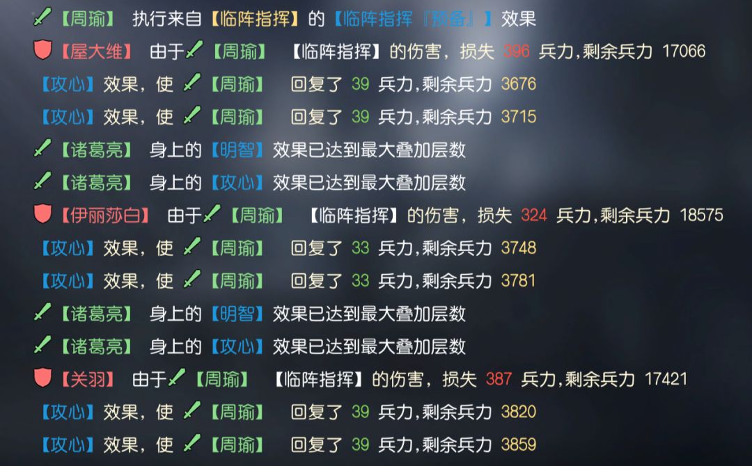 最后我们测试制衡与伟大艺术间的配合度,可以看到,当我们使用图中配置后,虽然制衡的效果来源为杨延昭,但他携带伟大艺术时,并为让制衡的攻心效果得到治疗加成。即使将伟大艺术交由周瑜使用,战斗中攻心仍旧以固定10%的伤害比例进行治疗,未得到治疗加成。