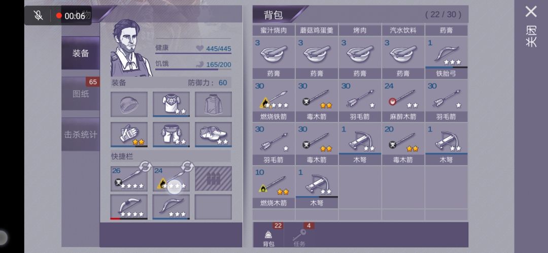 由于木弩装在身上,箭在弩上,不占背包。 以上物品携带共八个背包格子,剩下两个格子,根据喜好带物品吧