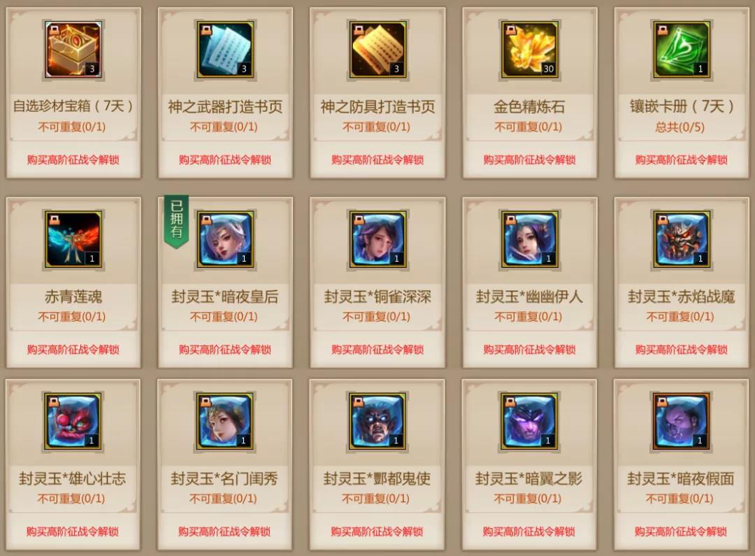 进阶奖励:达到指定征战令等级且购买了进阶令后可领取。