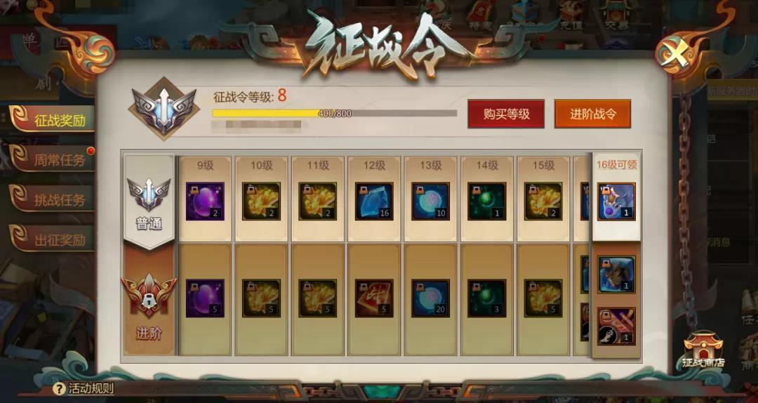 这次的奖励可以分为四个部分,分别为普通奖励,进阶奖励,战力奖励以及出征奖励。普通奖励:达到指定的征战令等级即可领取。