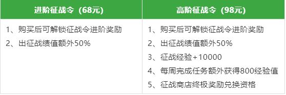 3.如购买进阶征战令和高阶征战令征战令,出征战绩值将加成50%,将更快的获得征战经验。
